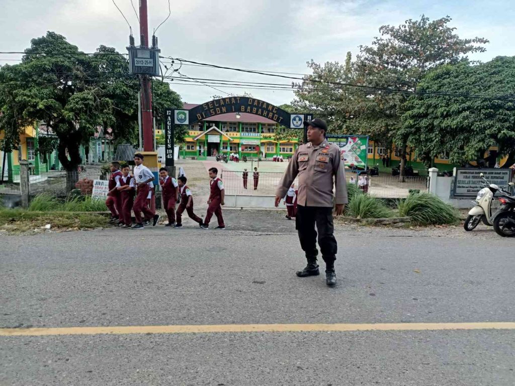 DALAM UPAYA MEMBERIKAN RASA AMAN BAGI ANAK SEKOLAH PERSONIL POLSEK BABAHROT POLRES ABDYA MELAKSANAKAN KEGIATAN STRONG POINT PAGI