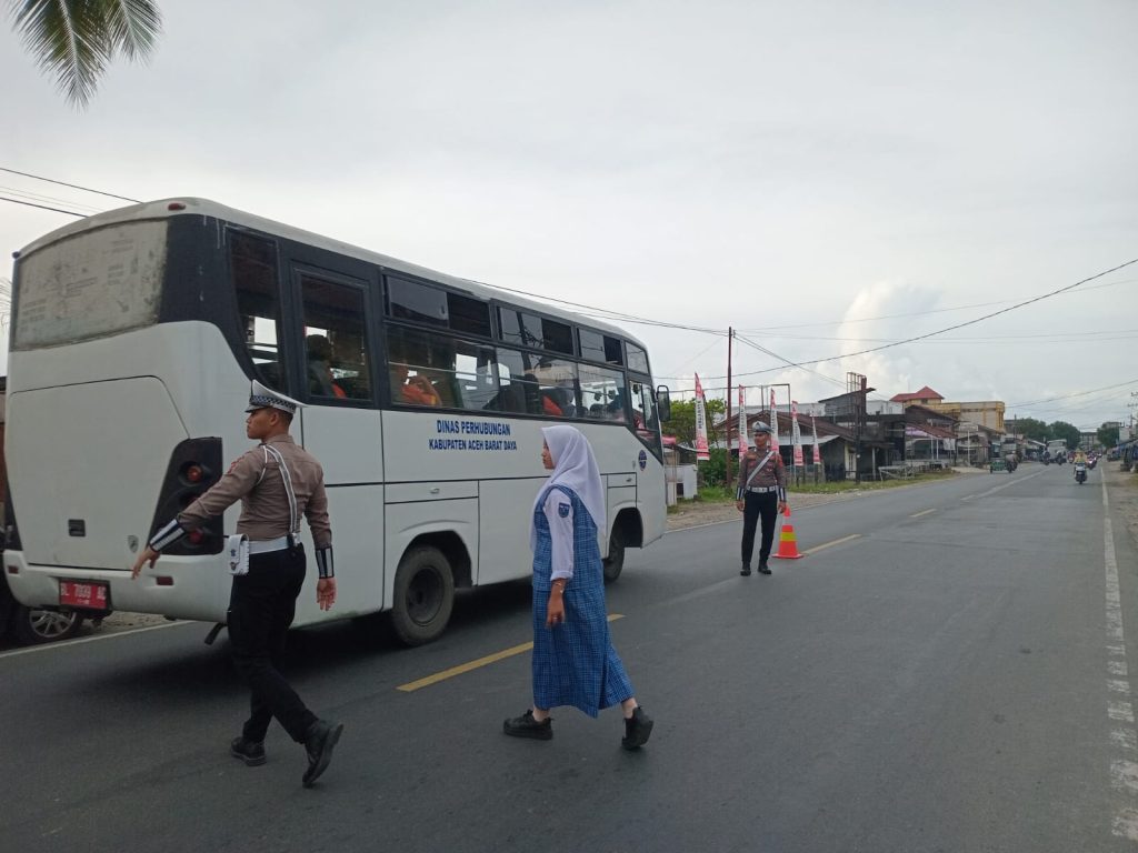 Aceh Barat Daya – Personel Sat lantas Polres Aceh Barat Daya melaksanakan giat Strong Point pagi di SD IT Rabbani Qur’an, School MTsN Susoh, SDN 1 Blangpidie, SMPN 1 Blangpidie, Sp. Puskesmas, dan Sp. Ceurana Kabupaten Aceh Barat Daya. Kamis (09/10/2025).