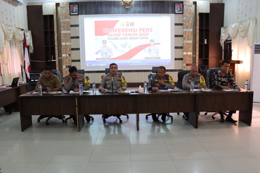 Aceh Barat Daya – Kapolres Aceh Barat Daya (Abdya) memimpin Konferensi Pers Akhir Tahun 2023, yang di dampingi beberapa PJU Polres Abdya, bertempat di Aula Mapolres Abdya, Jumat (29/12/2023).