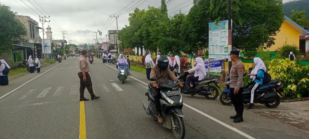 Aceh Barat Daya – Personil Polsek Kuala Batee Polres Aceh Barat Daya melaksanakan kegiatan rutin Strong Point pagi di Depan SMP Negeri 01 Kuala Batee, Kecamatan Kuala Batee, Kabupaten Aceh Barat Daya. Selasa (23/07/2024).