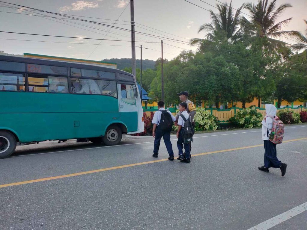 PERSONIL POLSEK KUALA BATEE POLRES ABDYA MEMELIHARA SITUASI YANG AMAN DAN MEMBERIKAN RASA AMAN BAGI ANAK SEKOLAH MELALUI GIAT STRONG POINT