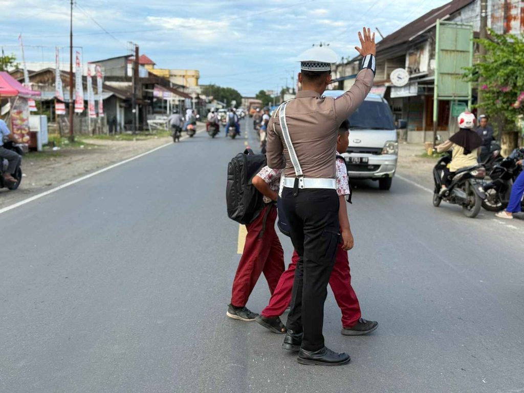 Aceh Barat Daya – Personel Sat lantas Polres Aceh Barat Daya melaksanakan giat Strong Point pagi di Sp. Bank Aceh, Sp. Puskesmas dan Sp. Bukit Hijau, dan SMPN 1 Blangpidie Kabupaten Aceh Barat Daya. Rabu (17/09/2025).