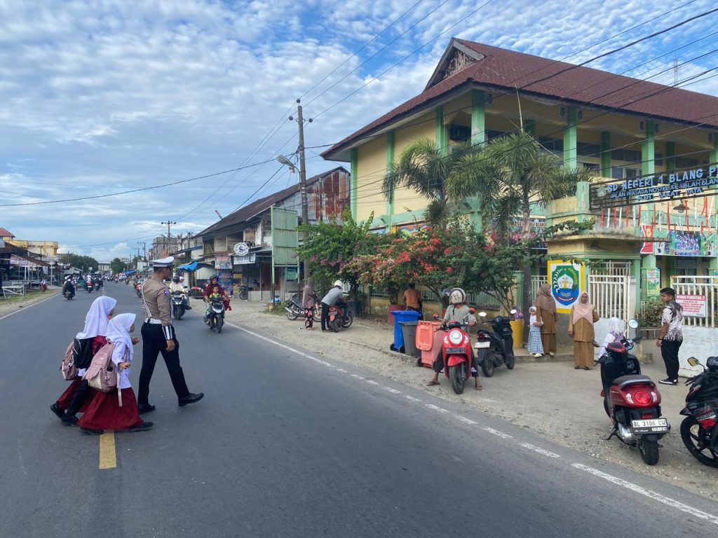 Aceh Barat Daya – Personel Sat lantas Polres Aceh Barat Daya melaksanakan giat Strong Point pagi di Sp. Bank Aceh, Sp. Puskesmas dan Sp. Bukit Hijau, dan SMPN 1 Blangpidie Kabupaten Aceh Barat Daya. Selasa (23/09/2025).