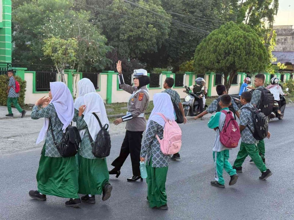 Aceh Barat Daya – Personel Sat lantas Polres Aceh Barat Daya melaksanakan giat Strong Point pagi di Sp. Bank Aceh, Sp. Puskesmas dan Sp. Bukit Hijau, dan SMPN 1 Blangpidie Kabupaten Aceh Barat Daya. Kamis (18/09/2025).