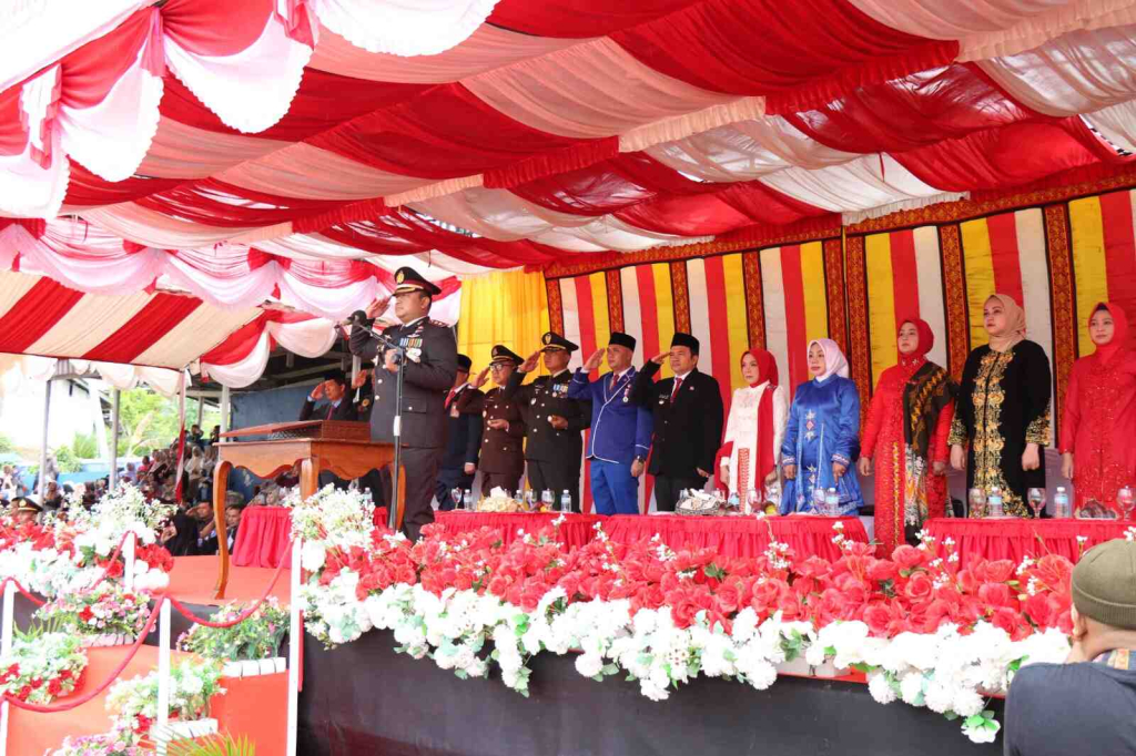 Aceh Barat Daya – Kapolres Abdya, AKBP Agus Sulistianto SH, SIK. beserta Ketua Bhayangkari, Ny. Retno Agus Sulistianto hadiri Upacara Penurunan Bendera Merah Putih dalam rangka Peringatan Hari Kemerdekaan Republik Indonesia Ke – 79 Tahun 2024 yang bertempat di Lapangan Bola Kaki Persada Desa Kedai Siblah Kec. Blangpidie Kab. Abdya. Minggu (18/08/1014)